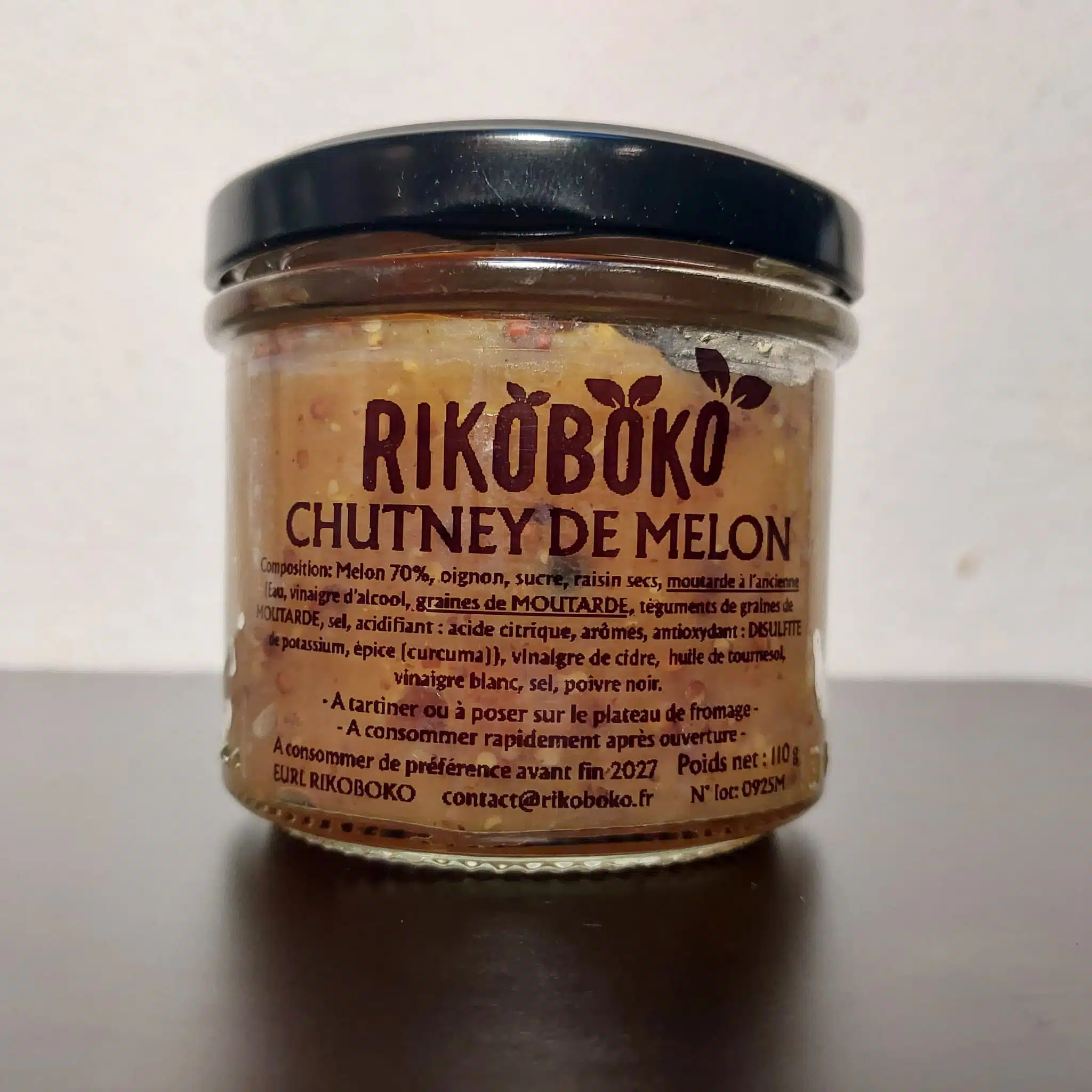 COMPOSITION: Melon 70%, oignon, sucre, raisin secs, moutarde à l’ancienne (Eau, vinaigre d'alcool, graines de MOUTARDE, téguments de graines de MOUTARDE, sel, acidifiant : acide citrique, arômes, antioxydant : DISULFITE de potassium, épice (curcuma)), vinaigre de cidre, huile de tournesol, vinaigre blanc, sel, poivre noir.